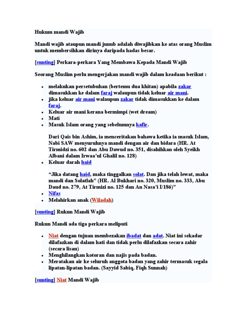 Dengan itu pasangan yang ber jimak boleh melewatkan untuk mandi wajib sehingga pagi dan mengerjakan mandi wajib sejurus. Perkara-perkara yang membawa kepada mandi wajib Seorang Muslim perlu mengerjakan mandi wajib dalam keadaan berikut. Hubungan suami istri jimak Keluar mani sperma Haid atau.